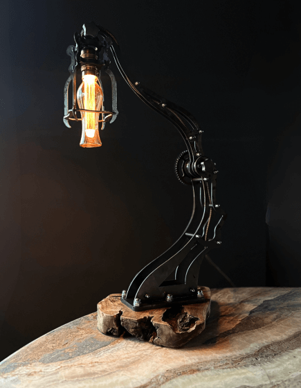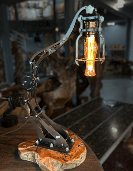 Lampa stojąca to unikalne połączenie naturalnego uroku i industrialnego designu. Stelaż lampy wykonany jest z stalowych, wypalanych części, które zostały patynowane, nadając im wyjątkowy, surowy charakter. Dzięki ruchomym elementom konstrukcji, lampa może być łatwo dostosowana do indywidualnych preferencji, pozwalając na regulację kąta padania światła. Kawałek drewna tekowego stanowi stabilną podstawę, podkreślając naturalną teksturę i ciepło materiału. Żarówka o kształcie tulipana dodaje lampie subtelnej elegancji, tworząc niepowtarzalny efekt świetlny. To oryginalny element dekoracyjny, który wprowadza do wnętrz wyjątkowy, nowoczesny akcent.